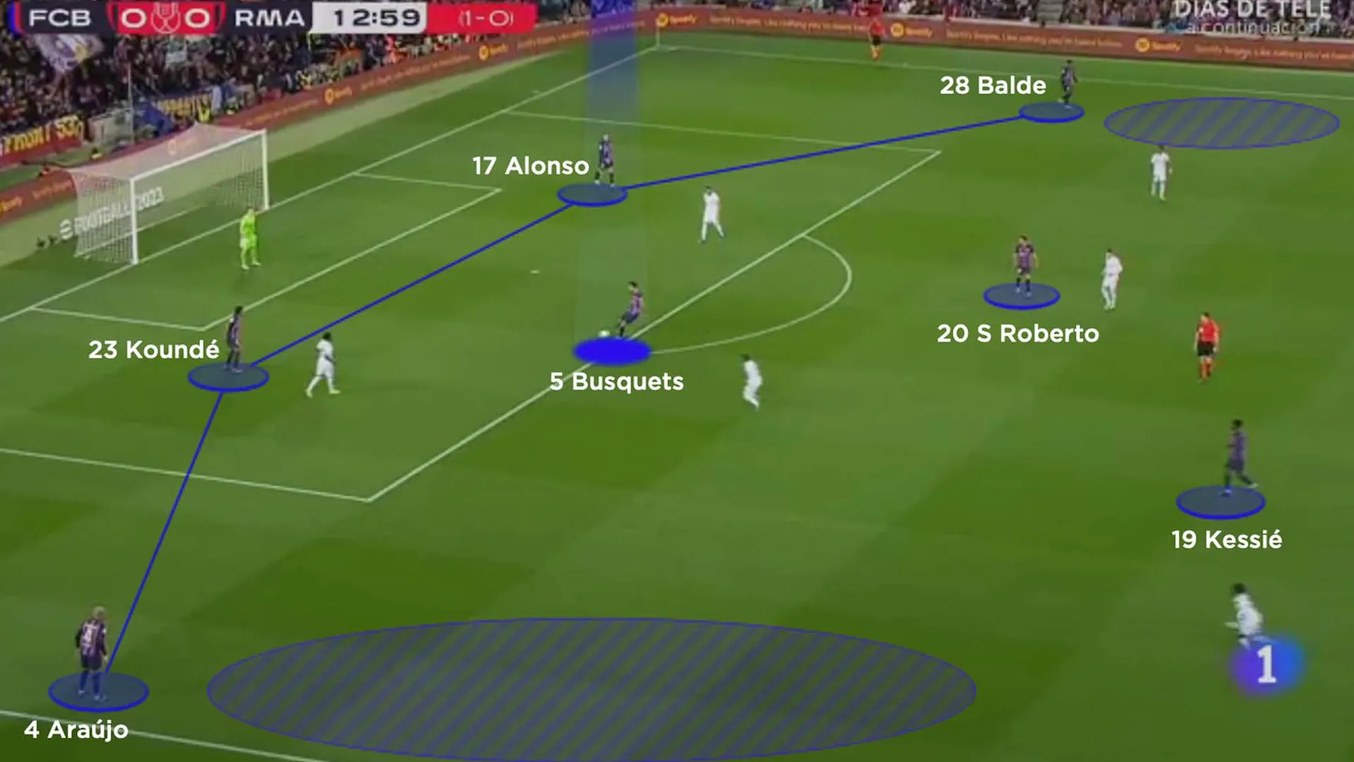Notice how Sergio Busquets (5) acts as a pivot, with Sergi Roberto (20) and Frank Kessie (19) providing passing angles. This creates the following: