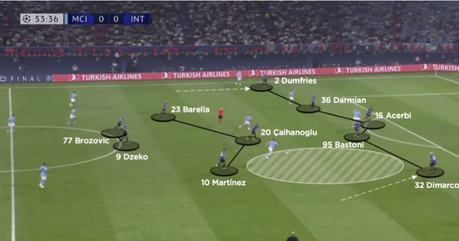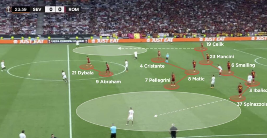 This diagram demonstrates the transformative positioning of wing-backs in the 3-5-2 system. Notice how the wing-backs (shown n the wider positions both Spinazzola and Celik can operate at different heights on the pitch. When positioned higher, as illustrated, they essentially become wingers, providing crucial width in attack. When they drop deeper, they form part of a five-man defensive line.